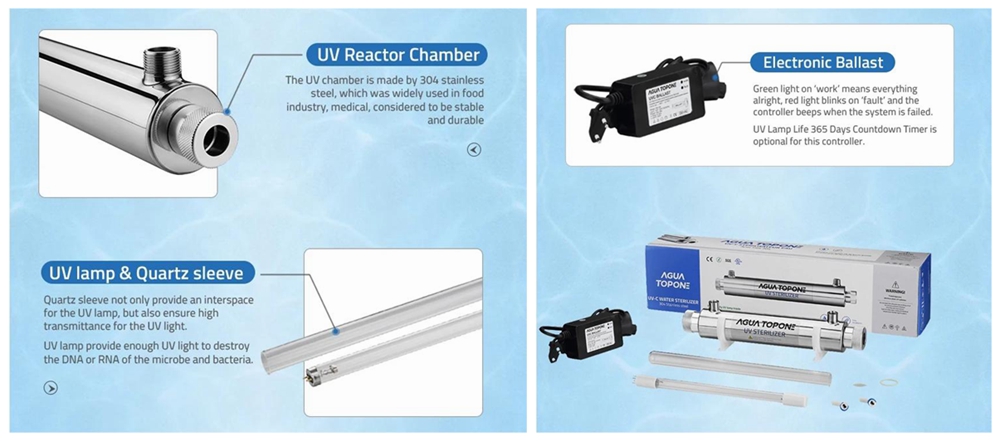 The UV sterilizer does not use any chemicals, and will not cause secondary pollution to the water body and the surrounding environment. Does not change any components in the water.