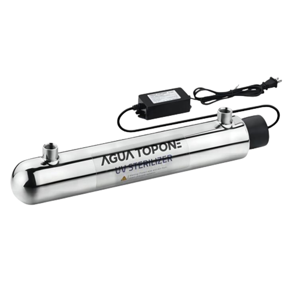 A UV light water treatment system allows water to flow around a UV lamp, inactivating bacterial cells. Because cells have to be exposed to enough light, it’s important to control the flow rate and make sure all water is exposed for enough time.
